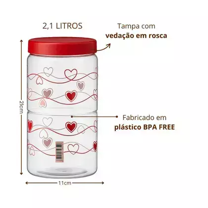 O Organizador Coração 2100ml da Tiba é ideal para armazenar alimentos de forma prática e charmosa. Com estampa delicada de coração, ele é perfeito para manter a organização da cozinha ou lancheiras, garantindo praticidade e estilo no dia a dia.